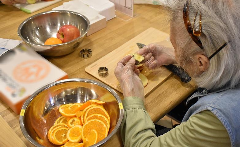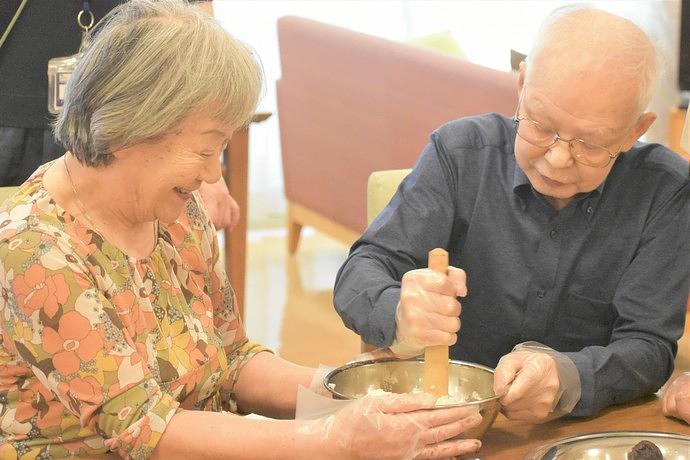 通常毎月開催している、ご入居者様やご家族様の「想い出のお食事」を作っていただくアクティビティ。想い出の食材や調理法をおうかがいし、馴染みのある調理道具もご用意させていただきます。大切な人と想い出のお料理を作り、お食事を召し上がっていただく時間を通じて、「その方らしく」お過ごしいただきたい、という思いから企画させていただきました。アクティビティを通じて、「次はなにを作ろうかしら」と、次回の開催をたのしみにされている姿を見せてくださっています。