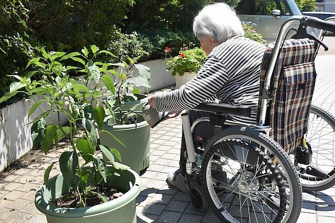 「リハビリホームくらら上井草」は、23区に位置しているとは思えないほど、緑に囲まれた場所にあります。その環境を活かし、ホームの敷地内では季節のお花やお野菜を育て、ホーム内でもお花を生けたり、外で育てた野菜を毎日のお料理に使ったりしています。そのような刺激に触れることが、ご入居者様のやりたい気持ちにも繋がっているようです。ご入居者様にご自分らしくメリハリのある生活を送っていただけるよう、環境づくりにも力を入れています。