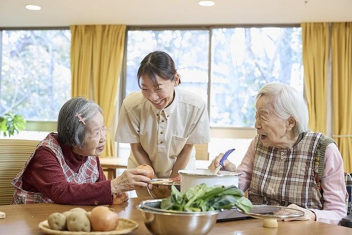 1グループ10人ほどの、少人数でのユニットだからこそ生まれる、ご入居者様同士のちょうどよい距離感。おひとりではむずかしいことでも、支え合えばできること、一緒によろこびを分かち合えること、「誰かのため」に生まれる意欲など、一緒に過ごすお仲間がいるからこそ、『「お仲間」ざんまい』ともいえる、充実した生活につながっているご様子です。また、気心の知れた顔なじみのスタッフがご入居者様同士の生活をサポートさせていただきます。