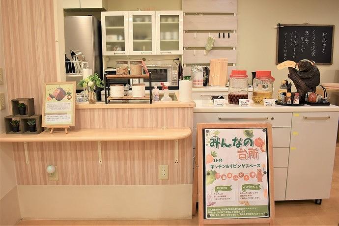 当ホームの1階リビングルーム兼食堂兼機能訓練室は「みんなの台所」として開放しており、ご入居者様だけではなくご家族様にもお使いいただける空間になっております。「みんなの台所」には、ご入居者様が漬けてくださった「らっきょう漬け」や「カリカリ梅」などが置いてあり、いつでも召し上がることができます。また、カフェコーナーも併設しており、いつでもお好きな飲み物をたのしみながら、ゆったりとした時間を過ごしていただいています。
