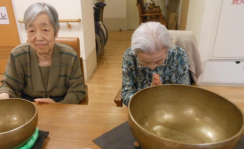 また、楽器を演奏しながら歌ったり、懐かしい歌を歌いながら当時を思い出していただいたりすることで、認知機能の維持に効果があるといわれている音楽療法も、月に2回程度外部講師に指導いただき開催しています。