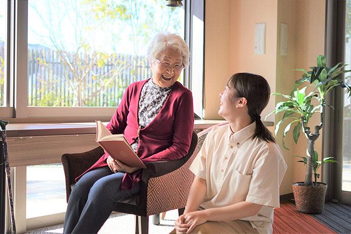 スタッフと談笑されるご入居者様 その方の「心のありか」に触れられるサービスの質を追求してまいります。