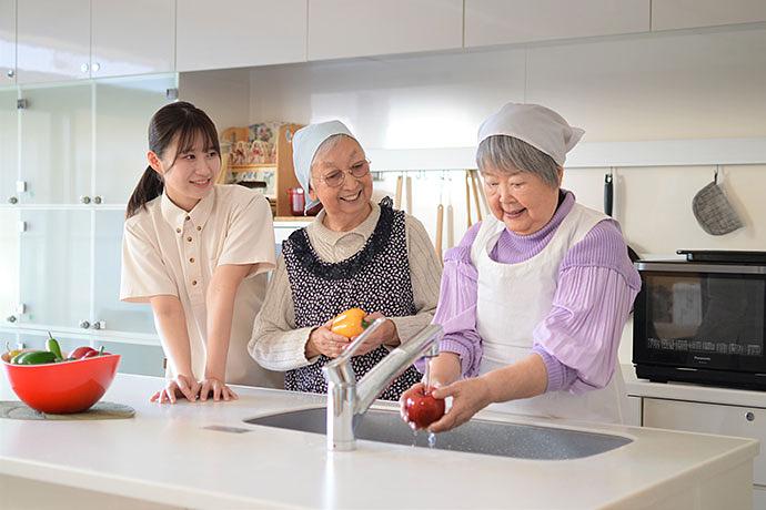 できないことだけに目をむけるのではなく、できることに目を向け、ご自身のお力を発揮していただこうと考えています。「洗いものや洗濯は自分でしたい」「庭の手入れが好き」「得意な料理をふるまいたい」など、これまでの生活の中でお好きだったこと、慣れ親しんでこられてきたことをホームにご入居されても継続して行っていただけるよう、お一人おひとりのご希望をうかがいながら、それを実現するためのサポートをさせていただいています。スタッフはご入居者様の「自分でやりたい」というお気持ちを尊重し、待ち、見守ることを心がけています。