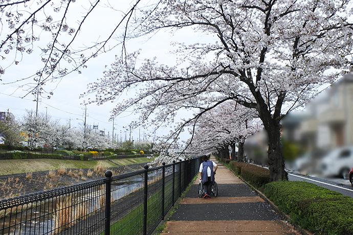 ホームから1分ほど(約92m)歩いたところには「乞田川」が流れており、川沿いの歩道でお散歩をお楽しみいただけます。春にはきれいな桜の道となり、ご入居者様の癒しの場ともなっています。ホームにご入居後も、身近に自然を感じることができる環境で、思い思いのゆったりとした時間をお過ごしください。