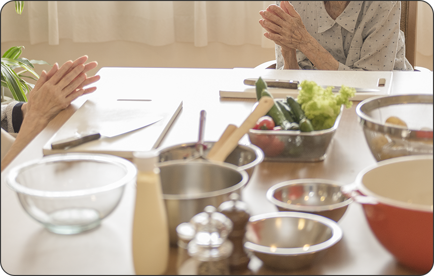 一人暮らしのご自宅であれば、包丁やコンロなど「危ないと思われるもの」は、ご家族様が使わせない選択もあるでしょう。でも、ホームには「お仲間」や私たち「スタッフ」がいて、ご自宅より安心な「場所」があります。だからこそ、最初からやらないと決めず、お一人おひとりに向き合い、その方の力を見極めながら「できる環境」を整えていく。